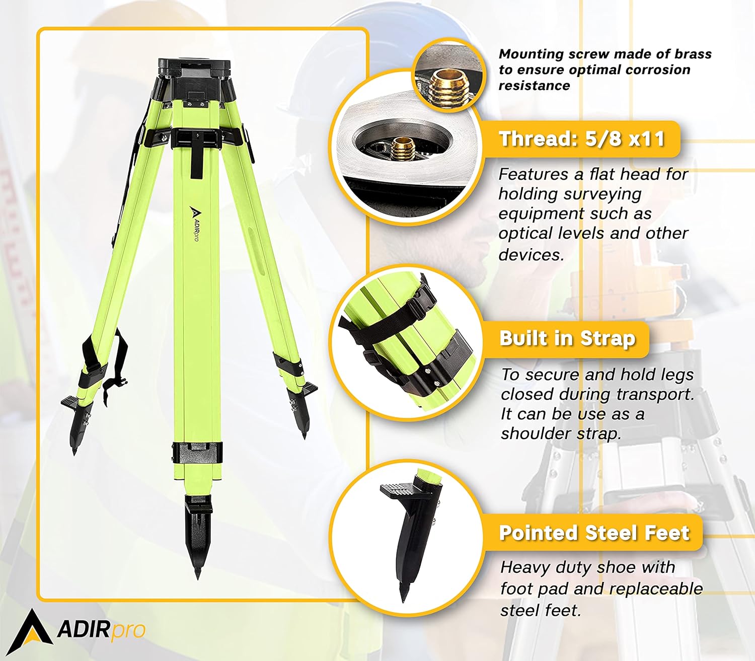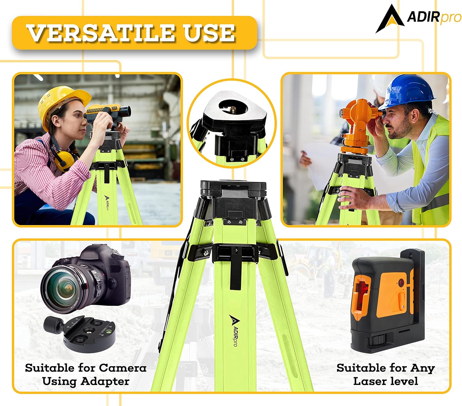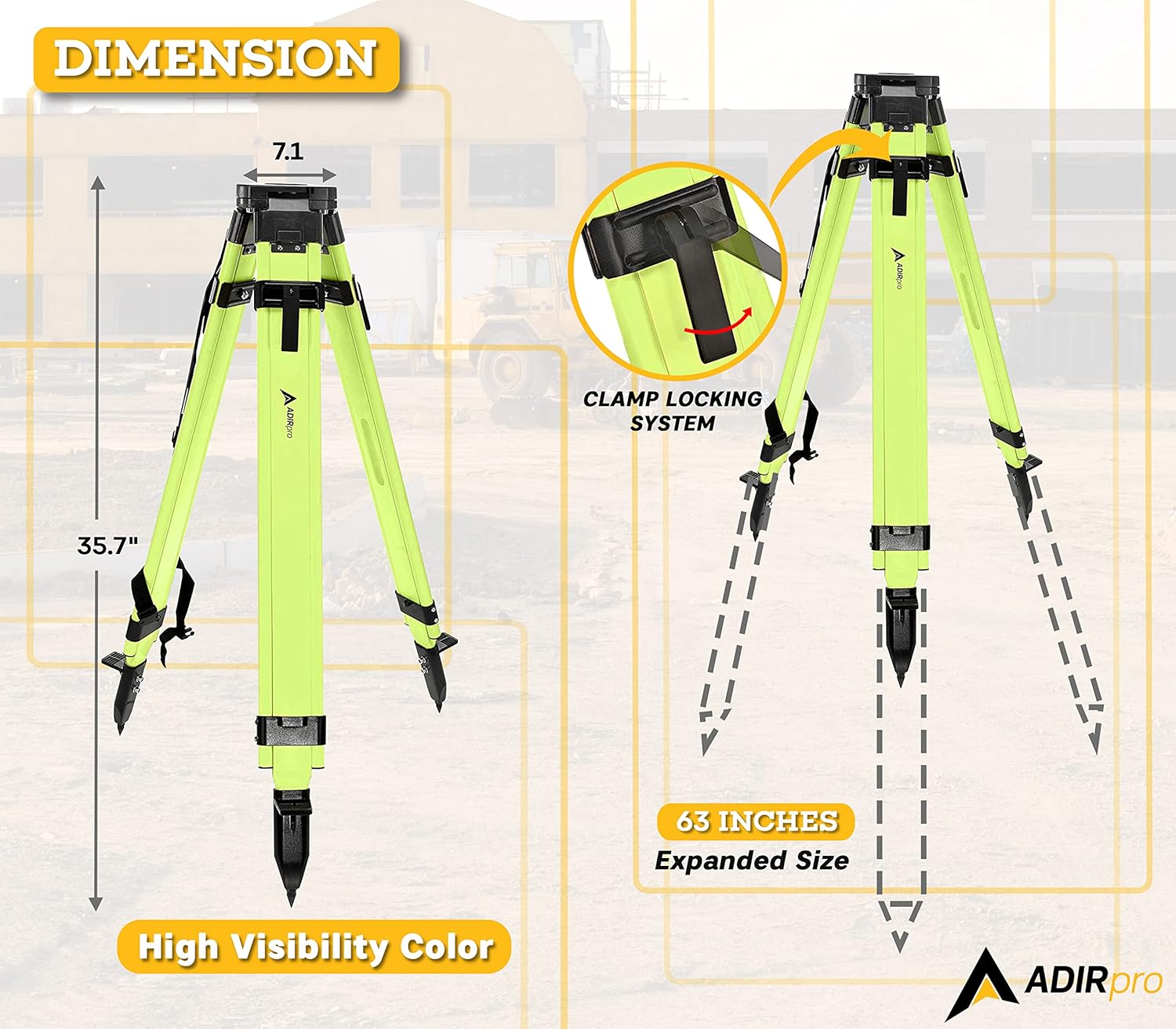 AdirPro Universal Survey Tripod – Laser Level Tripod – Transit Level Tripod – Quick Clamp – Heavy Duty Contractor Tripod 5/8” x 11” Thread (Green Aluminum)